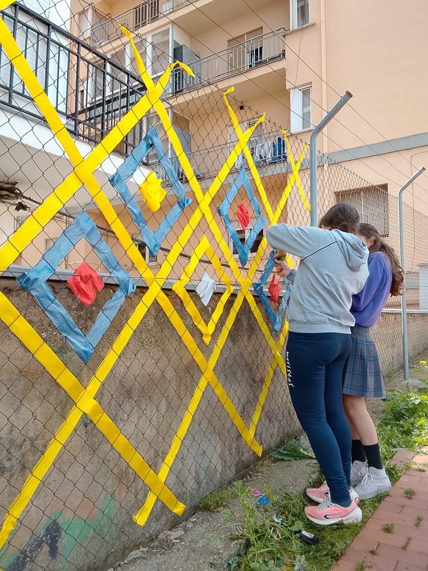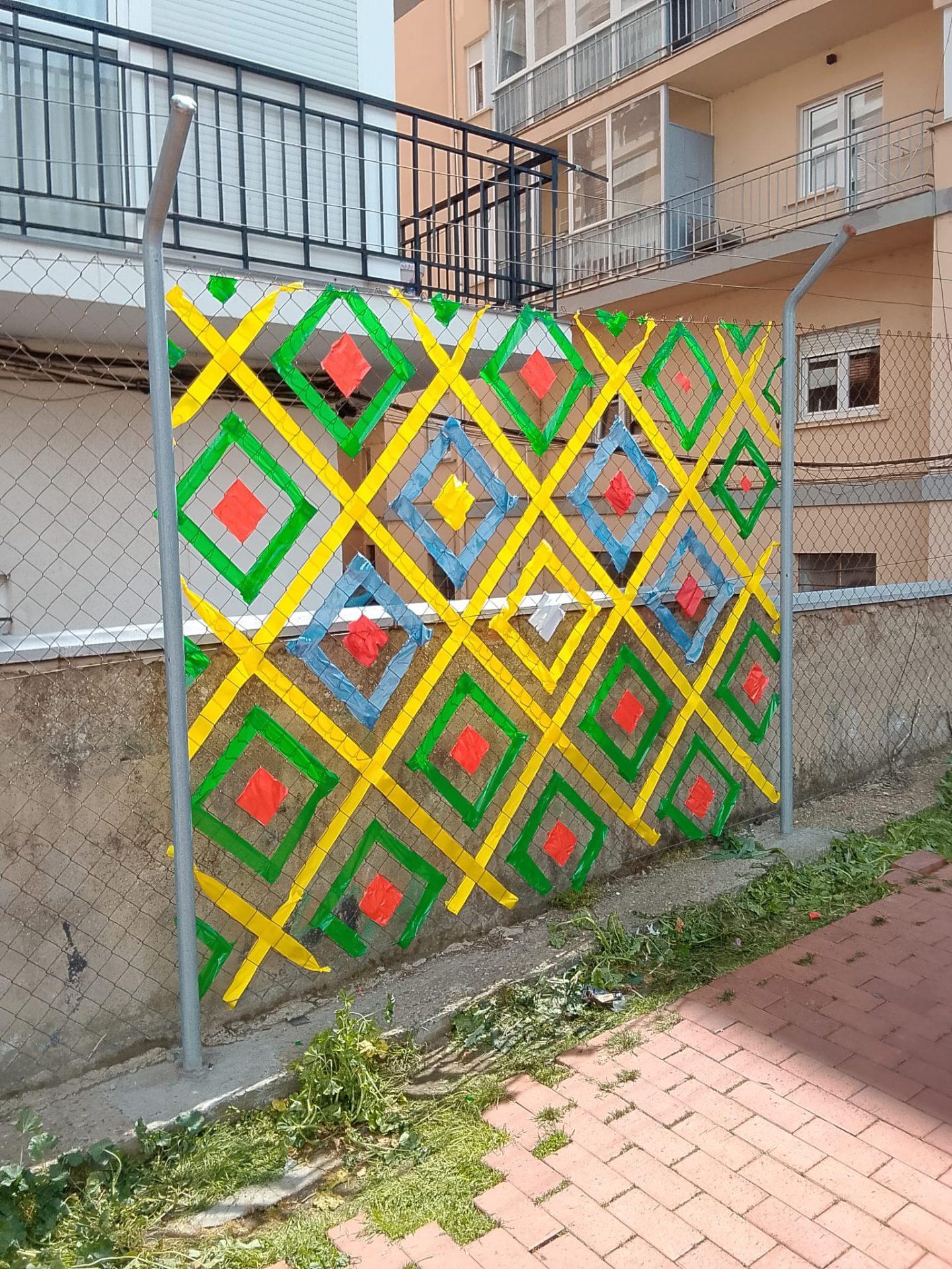 La obra destaca por su geometría y colorido. Utilizando cintas de tela, muchas de ellas de procedencia reciclada en un guiño a la sostenibilidad,  y otras plásticas, los estudiantes han tejido una composición geométrica que juega con la estructura propia de la valla, en colores amarillos, rojos, verdes, azules y blancos.