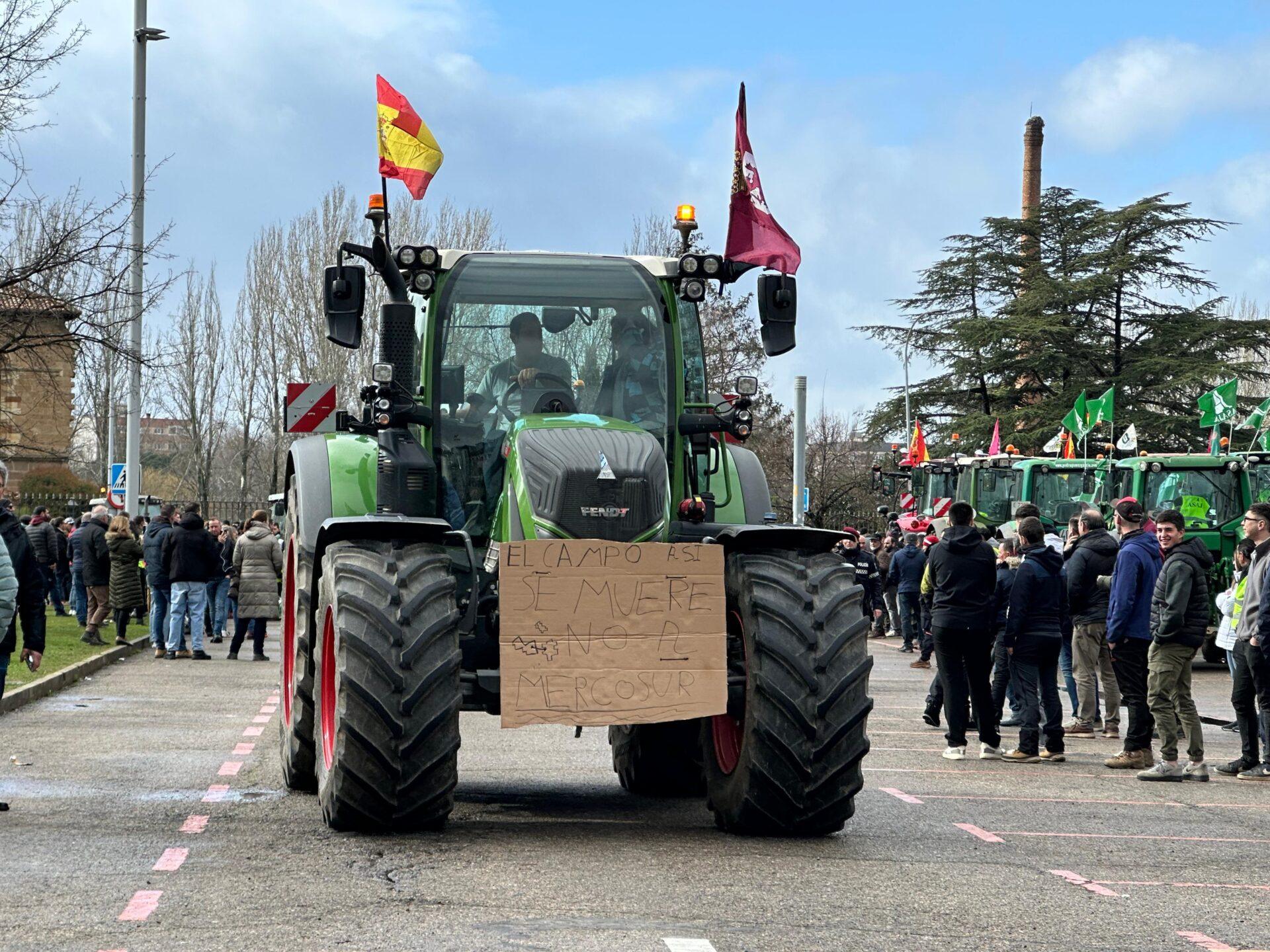 También desde el Bierzo han venido este jueves agricultores. Dos de ellos, procedentes de Cacabelos con explotaciones frutícolas y vitícolas, de pera y viñas, aseguran que la alianza les parece correcta pero no les parece que se luche con distintas armas. “A nosotros nos están exigiendo en la burocracia y los tratamientos fitosanitarios que ni a Uruguay o Paraguay o los países miembro de Mercosur les exigen”, apuntan a este medio. “Estamos compitiendo deslealmente contra ellos”.