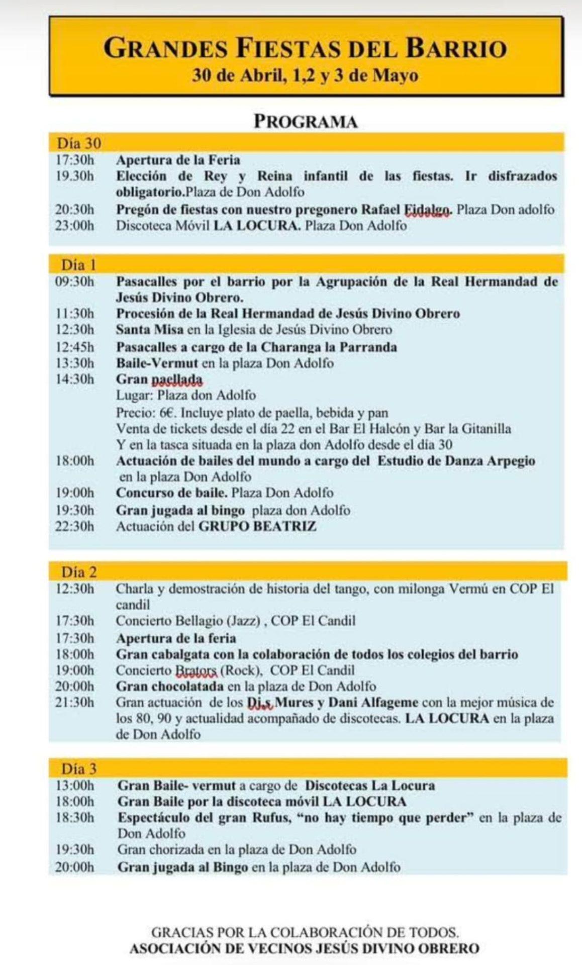 La jornada de hoy, 30 de abril, servirá de pistoletazo de salida con la actuación de la Disco Móvil “La Locura”, que pondrá el ritmo a la primera noche de festejos. Mañana, 1 de mayo, la programación tomará un cariz más tradicional y de convivencia vecinal con la celebración de una procesión, seguida de una “Gran Paellada” para todos los asistentes.
