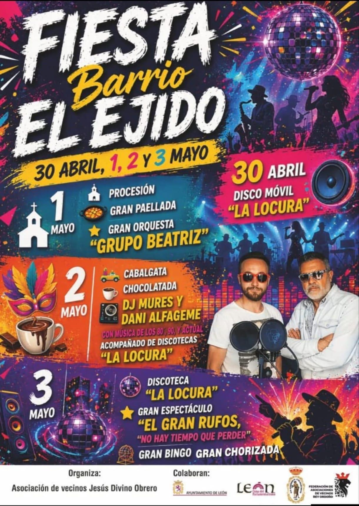 El popular barrio de El Ejido, en León, arranca hoy cuatro días de intensa actividad festiva con un programa cargado de música, gastronomía y eventos para todas las edades. Las celebraciones, organizadas por la Asociación de vecinos Jesús Divino Obrero con la colaboración del Ayuntamiento de León, una apuesta por el ocio en la ciudad durante este puente de mayo.