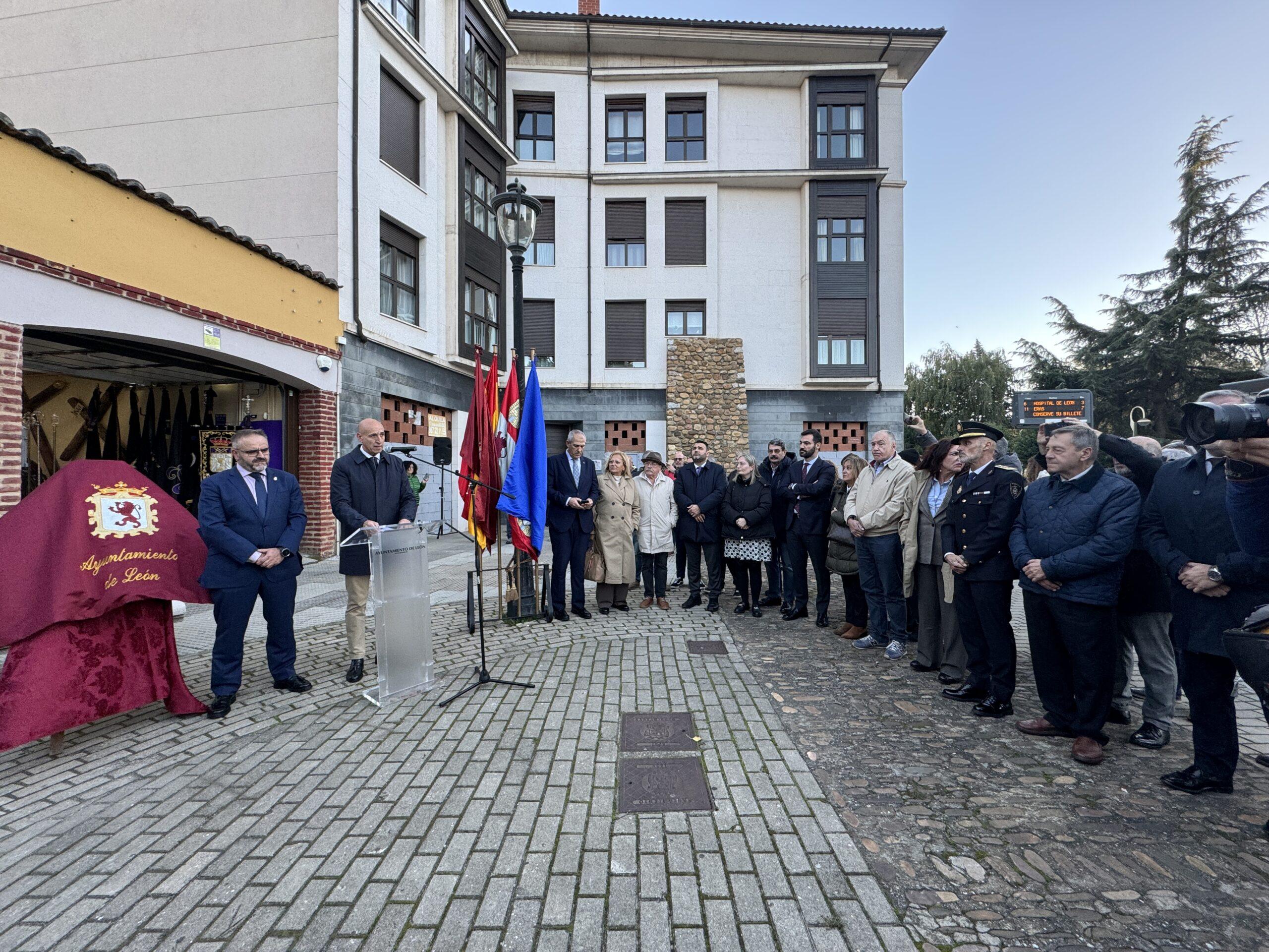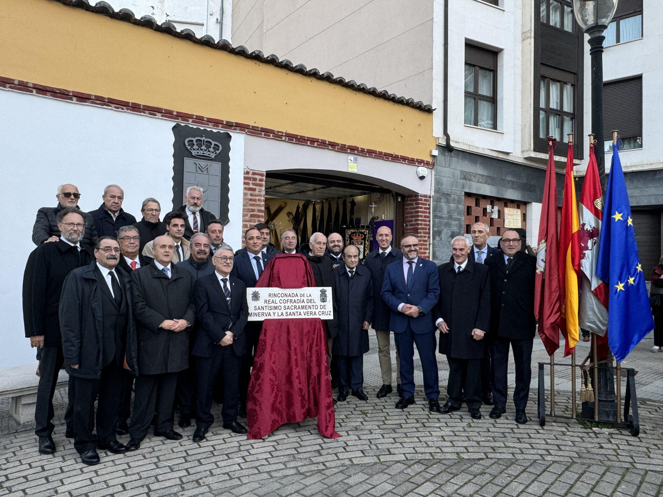 La Rinconada de la Real Cofradía del Santísimo Sacramento de Minerva y la Vera Cruz se suma en el nomenclátor municipal a las calles dedicadas a las cofradías leonesas. El alcalde de León, José Antonio Diez, acompañado de miembros de la Corporación y otras autoridades, junto al abad de la cofradía, Alejandro García Fernández, ha descubierto este viernes la placa que da nombre a esta rinconada, una pequeña plaza al final de la Muralla medieval, lugar donde se ubica la sede de la cofradía. Al acto también han asistido representantes de otras cofradías y hermandades de la Semana Santa leonesa.