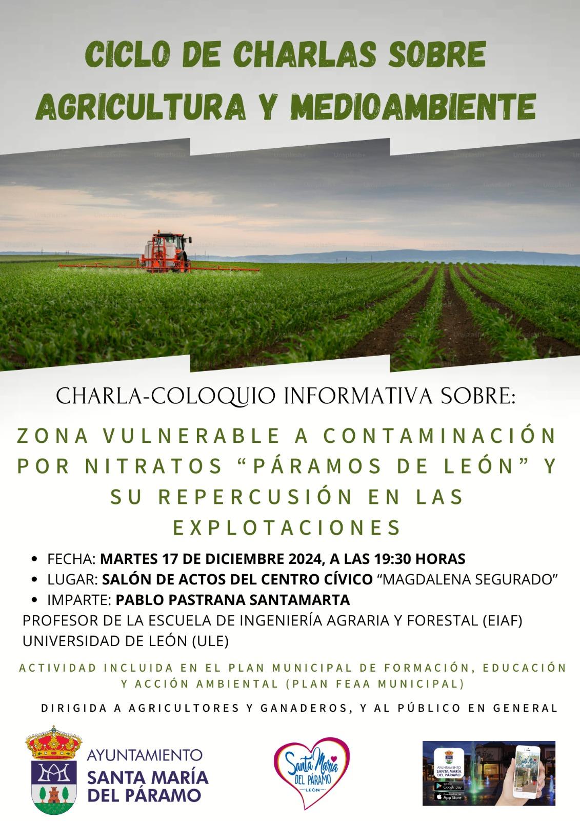 La primera charla versará sobre la “Zona vulnerable a contaminación por nitratos ‘Páramos de León’ y su repercusión en las explotaciones”, que será impartida por el profesor de la Universidad de León, D. Pablo Pastrana Santamarta, el próximo martes 17 de diciembre, a las 19:30 horas, en el Salón de Actos del Centro Cívico de la localidad paramesa.