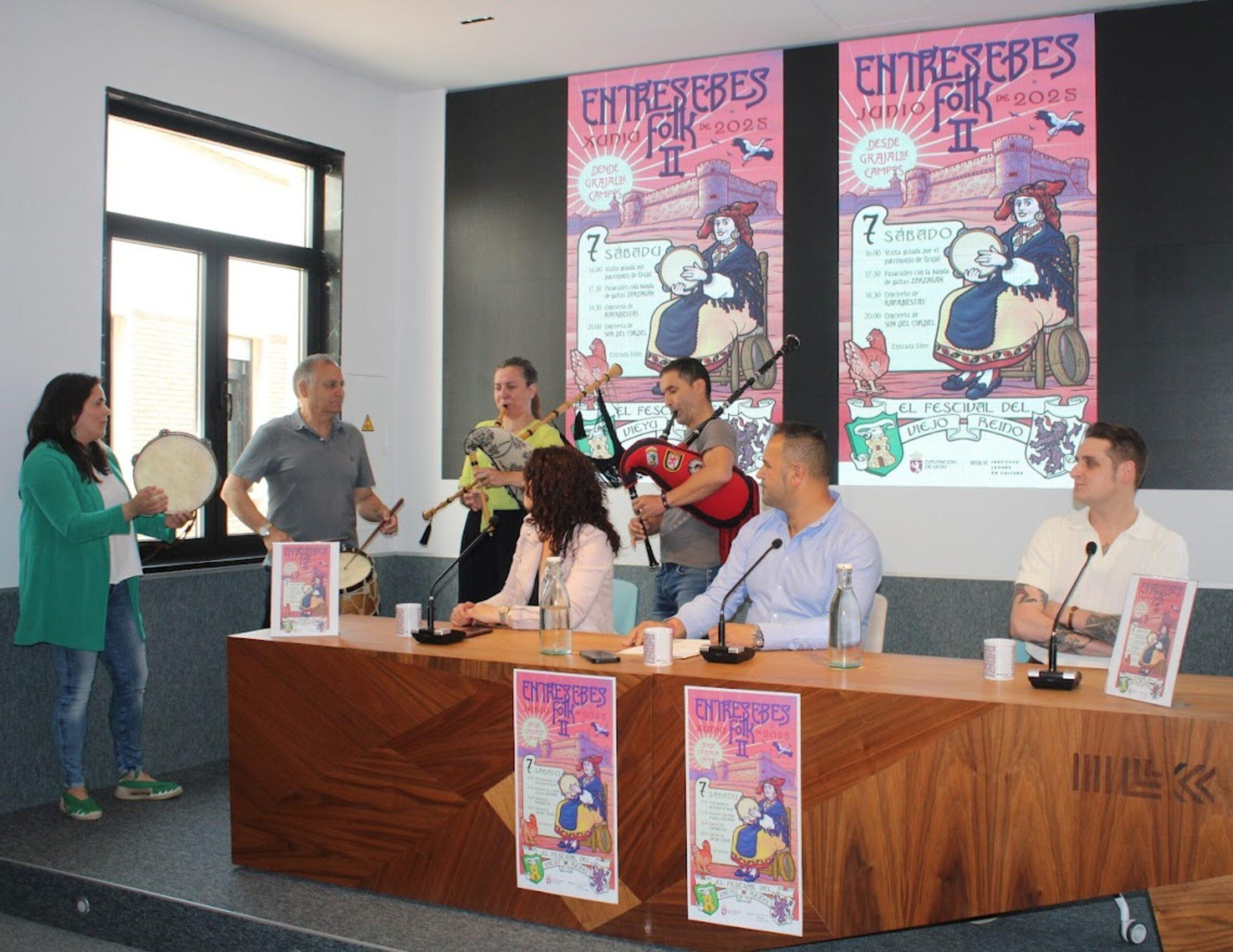 El diputado de Cultura, Arte y Patrimonio, Emilio Martínez Morán, se encargó de presentar esta segunda edición del ‘Entresebes’ junto a la alcaldesa de Grajal, Tamara Alonso, y al ilustrador Ricardo Escobar, autor del cartel anunciador. También estuvieron presentes la cantante y panderetera Xana Prieto en representación del grupo Son del Cordel, y tres miembros de la banda Zarzagán, quienes interpretaron durante el acto una jota tradicional leonesa: Jesús Robles (percusión), César Diez y Esther Pérez (gaitas). Emilio Martínez Morán recordó que este festival constituye una iniciativa del ILC cuyo principal objetivo “es el de valorar y difundir el trabajo realizado por los grupos folk y tradicional de las comarcas leonesas, a la vez que damos a conocer aspectos de nuestro riquísimo, pero a veces no siempre bien conocido, patrimonio histórico-artístico”. “De esta manera -prosiguió-, si la primera edición del festival tuvo lugar el año pasado en el monasterio de Santa María de Carracedo, municipio de Carracedelo, en pleno Bierzo Bajo, en esta ocasión nos iremos a la otra punta de la provincia, a la monumental villa de Grajal de Campos, para celebrar la continuación de un evento cuya primera edición tuvo un resultado muy positivo”.