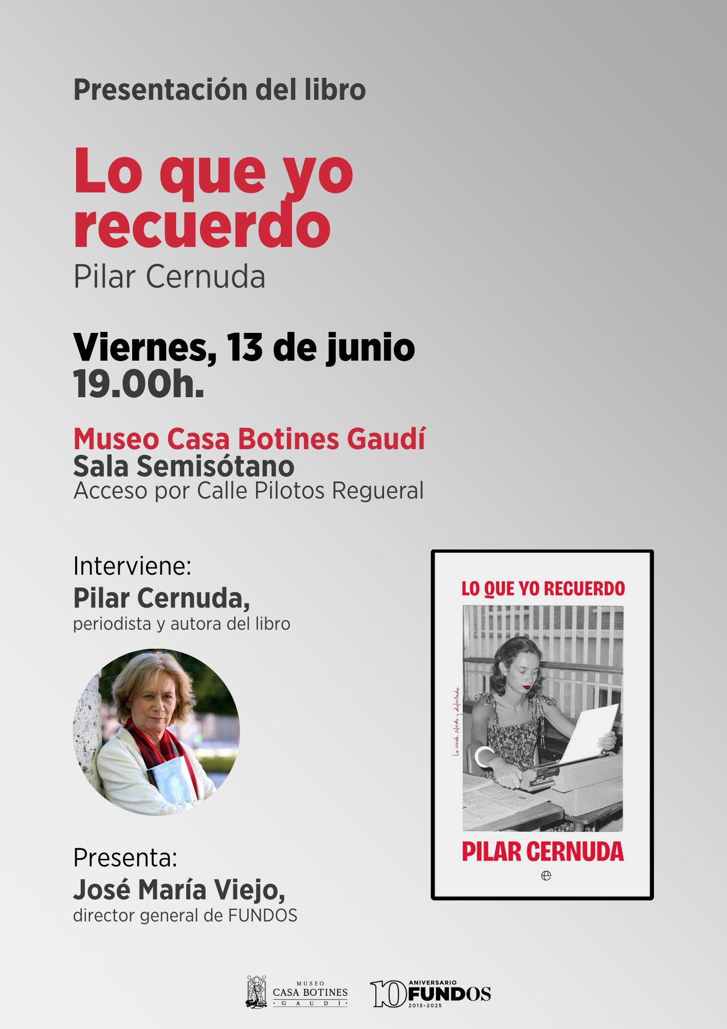 ICAL. La periodista y escritora Pilar Cernuda presentará este viernes 13 de junio, en el Museo Casa Botines de Gaudí, a partir de las 19 horas, su libro de memorias ‘Lo que yo recuerdo’, en un acto que estará presentado por el director general de la Fundación Obra Social de Castilla y León, José María Viejo.