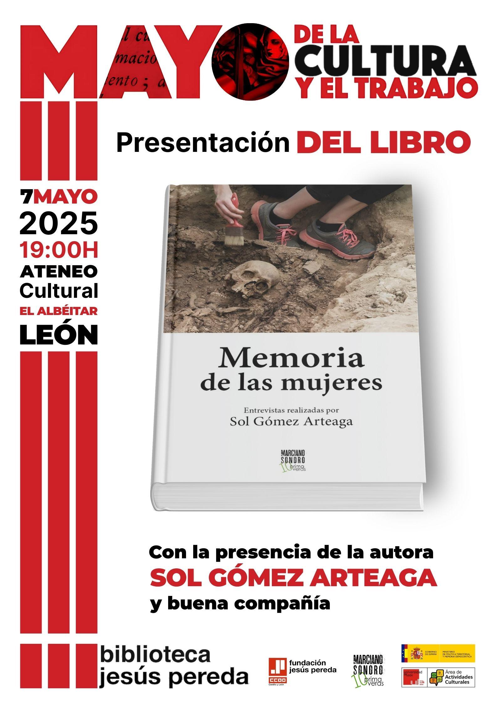 ICAL / La Fundación Jesús Pereda de Comisiones Obreras de Castilla y León, dentro del programa ‘Mayo de la Cultura y del Trabajo’, presentará este miércoles, 7 de mayo, a partir de las 19 horas, en el Ateneo Cultural El Albéitar de León, el libro ‘Memoria de las mujeres’, de Sol Gómez Arteaga, editado por la editorial Marciano Sonoro gracias a una subvención concedida por la Secretaría de Estado de Memoria Democrática.