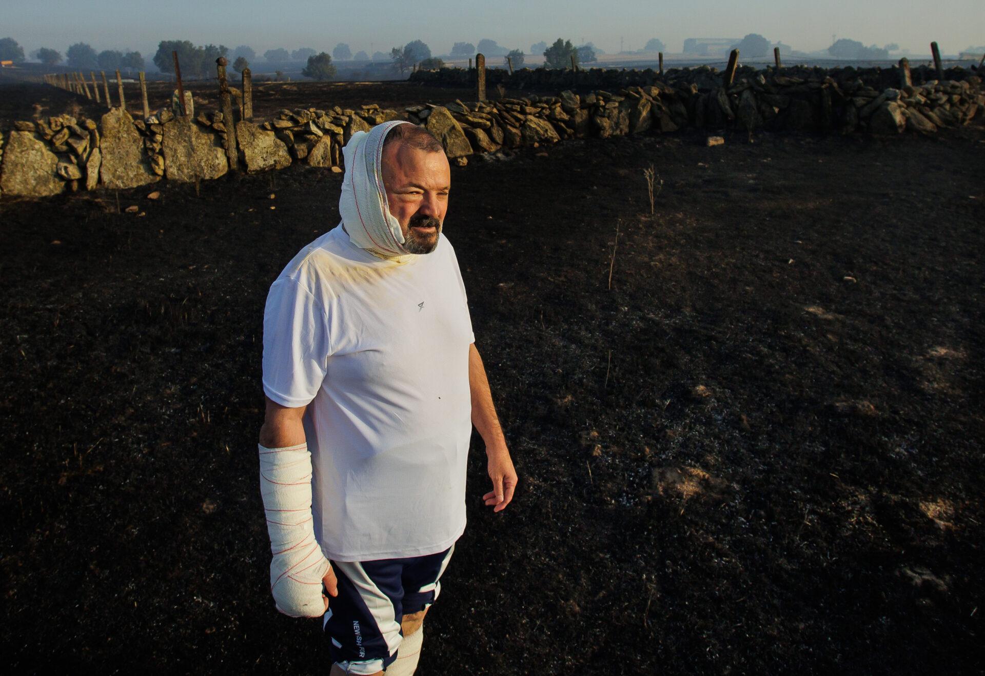 José Vicente. ICAL. José Manuel Blanco, con quemaduras en varias partes del cuerpo, observa la zona arrasada el incendio forestal de Ciperez (Salamanca)