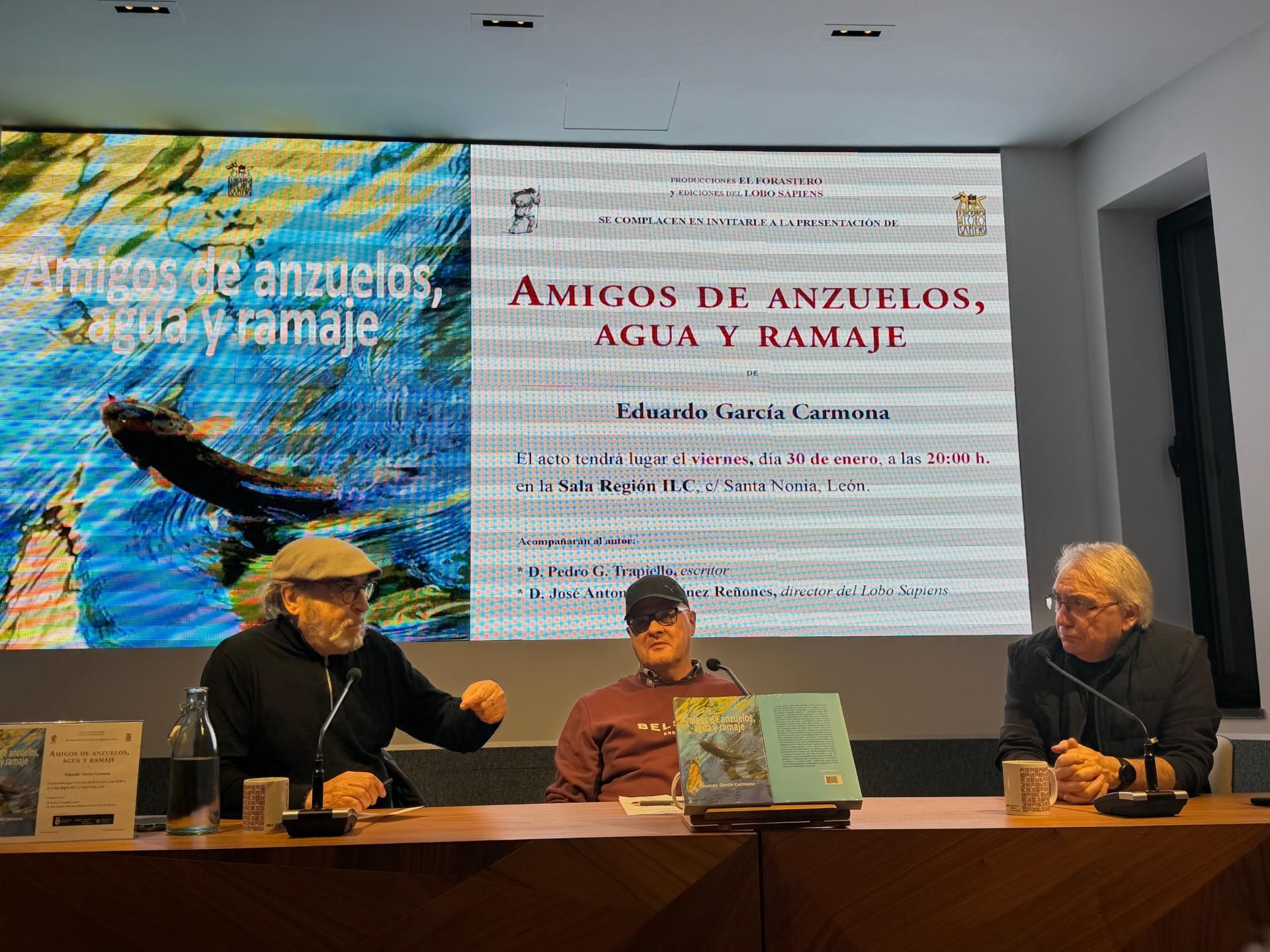La Sala Región del Instituto Leonés de Cultura se convirtió este viernes en el epicentro de la pesca continental con la puesta de largo de “Amigos de anzuelos, agua y ramaje”, la última obra del periodista y escritor Eduardo García Carmona. El acto contó con la participación del propio autor, acompañado por el cronista Pedro G. Trapiello, responsable del prólogo, y el editor de Lobo Sapiens, José Antonio Martínez Reñones.