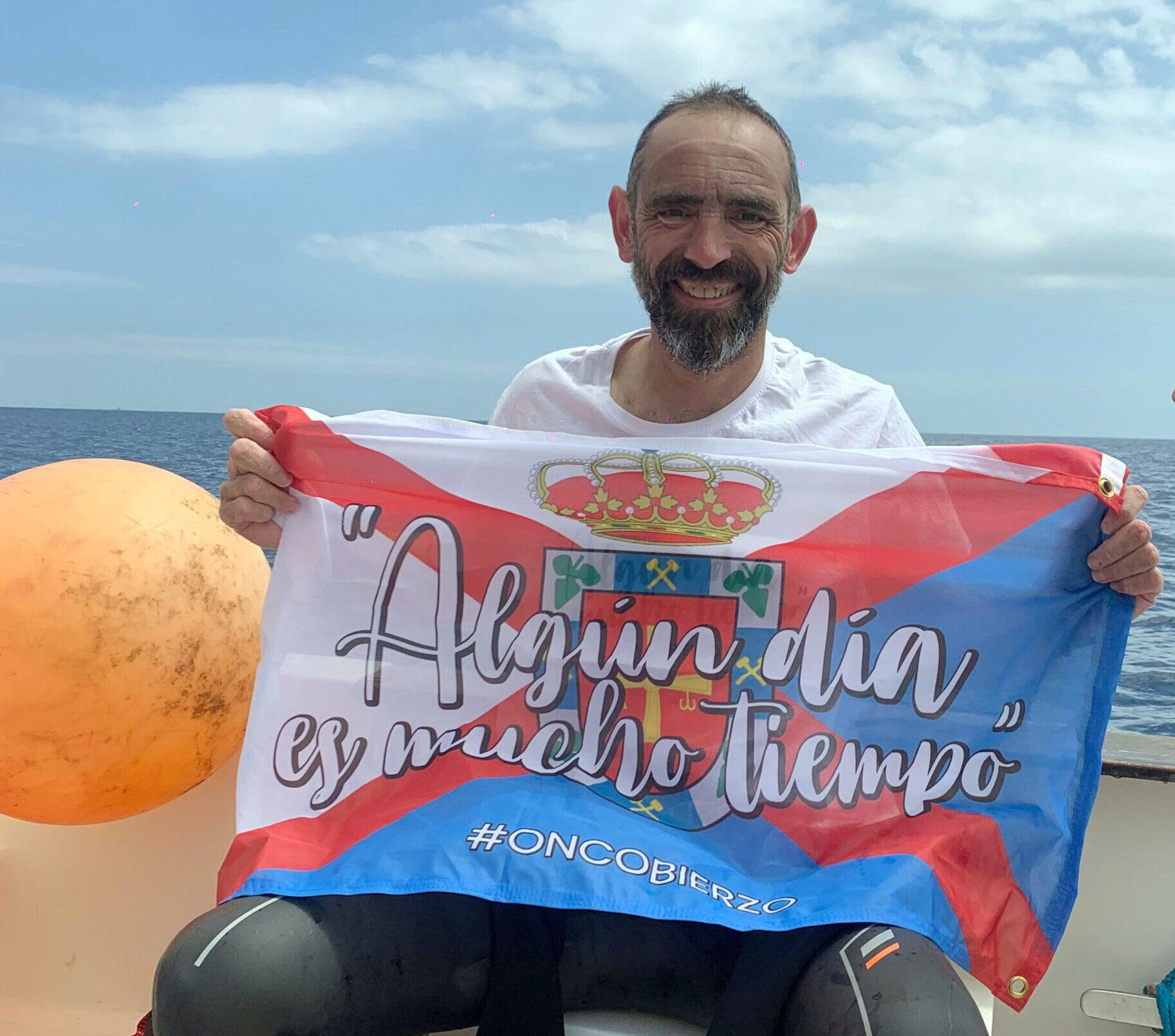 Tras casi cinco horas nadando, Baurco llegó a la costa africana, donde mostró la bandera del Bierzo con el lema ‘Algún día es mucho tiempo’ que la plataforma Oncobierzo ha hecho suyo.