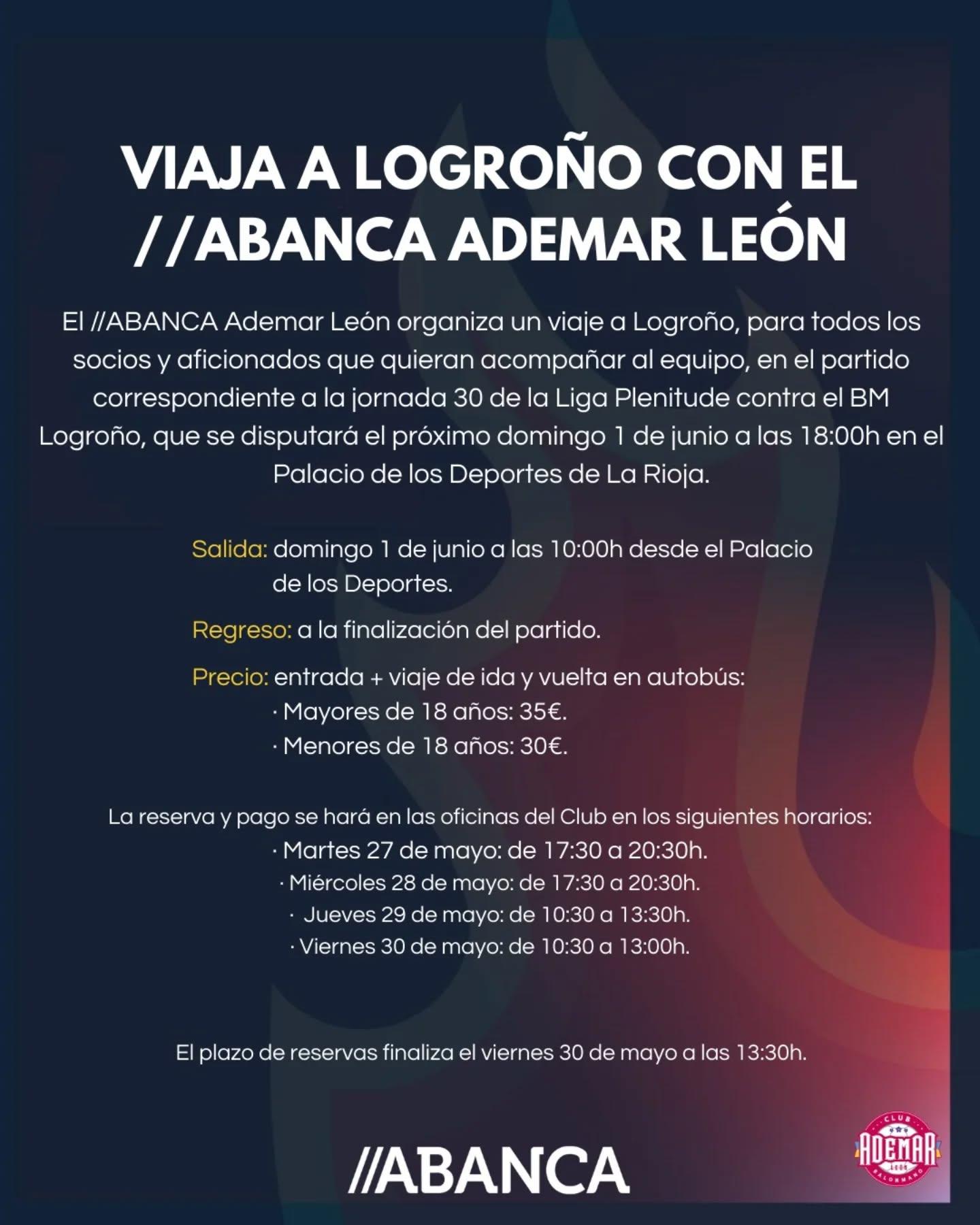 El Club Abanca Ademar León ha anunciado un viaje organizado para que socios y aficionados puedan acompañar al equipo en el último partido de la temporada. El encuentro, correspondiente a la jornada 30 de la Liga Plenitude, enfrentará al Ademar León contra el BM Logroño el próximo domingo 1 de junio a las 18:00 horas en el Palacio de los Deportes de La Rioja.