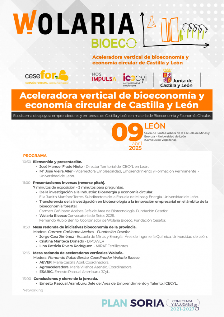 El programa incluye dos mesas redondas. La primera destacará iniciativas de bioeconomía surgidas en la provincia, con la participación de representantes de la Universidad de León, B.POWER y MIRAT Fertilizantes; la segunda estará dedicada a compartir experiencias de aceleradoras verticales como AEVER, Agroaceleradora y ESABIC. Dos sesiones que ofrecerán una visión integral del ecosistema de apoyo al emprendimiento sostenible. La jornada concluirá con un espacio de networking para fomentar sinergias entre agentes del sector.