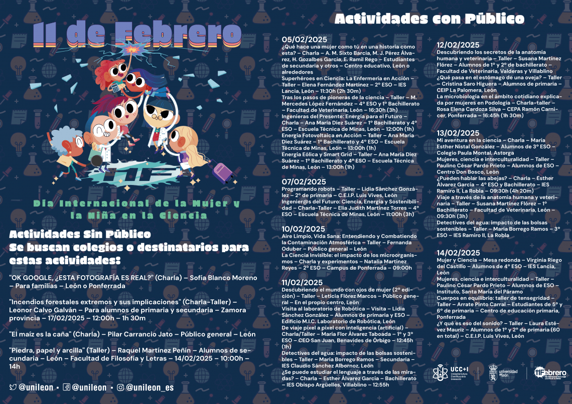 Los microorganismos, la energía eólica, la Inteligencia Artificial, la vida acuática o las pioneras de la ciencia son algunas de las temáticas que centran las actividades que organiza la Unidad de Cultura Científica de la ULE En total se han programado más de 30 talleres, charlas y experimentos en el campus de Vegazana y el … Sigue leyendo La ULE programa más de 30 talleres, charlas y experimentos en torno al Día de la mujer y la niña en la ciencia