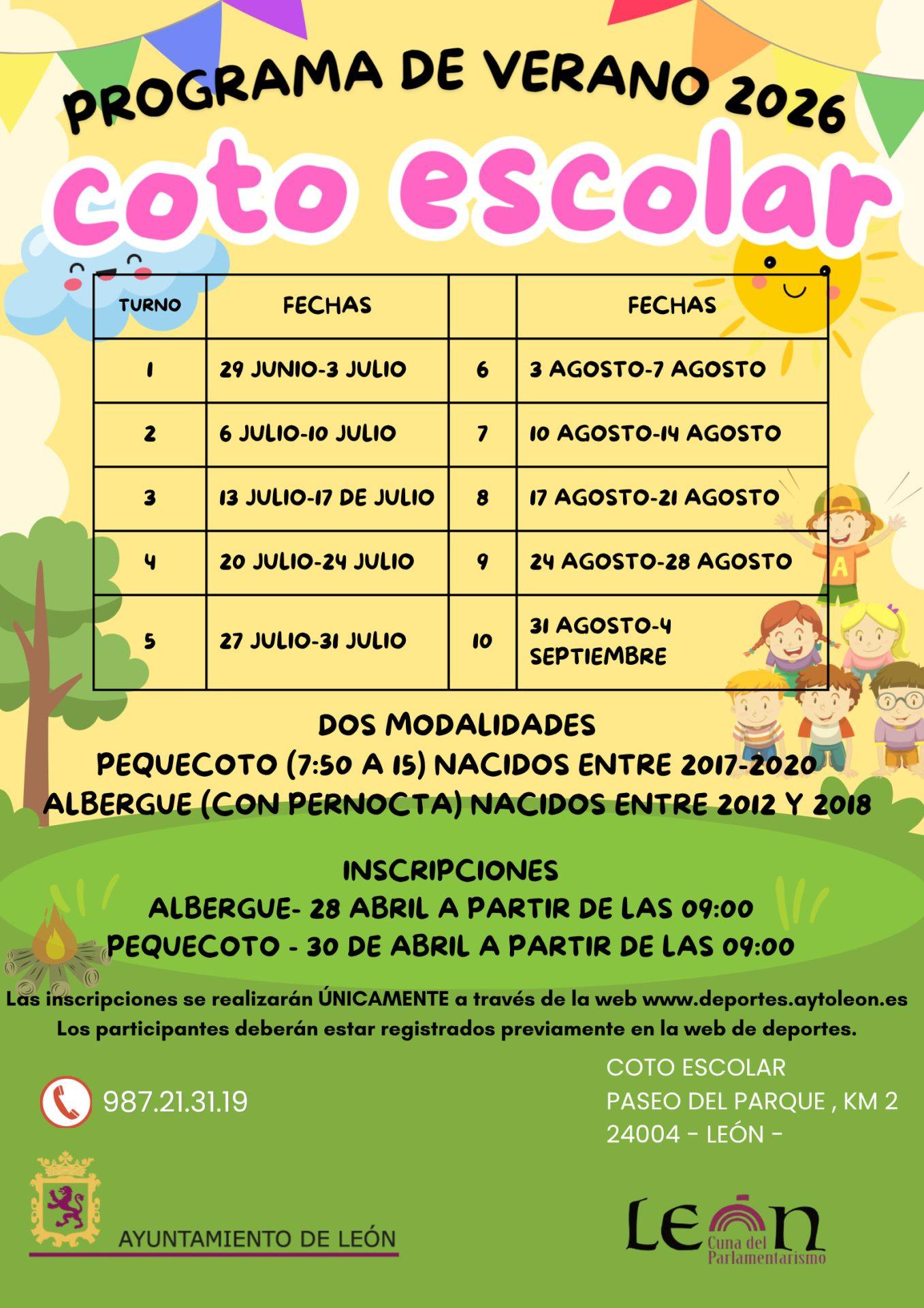 El Ayuntamiento de León pone en marcha un año más los Campamentos de Verano en el Coto Escolar, una iniciativa pensada para facilitar la conciliación familiar y ofrecer a niños y jóvenes una alternativa educativa y de ocio en un entorno natural. El programa de verano 2026 incluye dos modalidades: ‘Pequecoto’ y ‘Albergue’, con turnos semanales de lunes a viernes durante los meses de julio, agosto y la primera semana de septiembre.