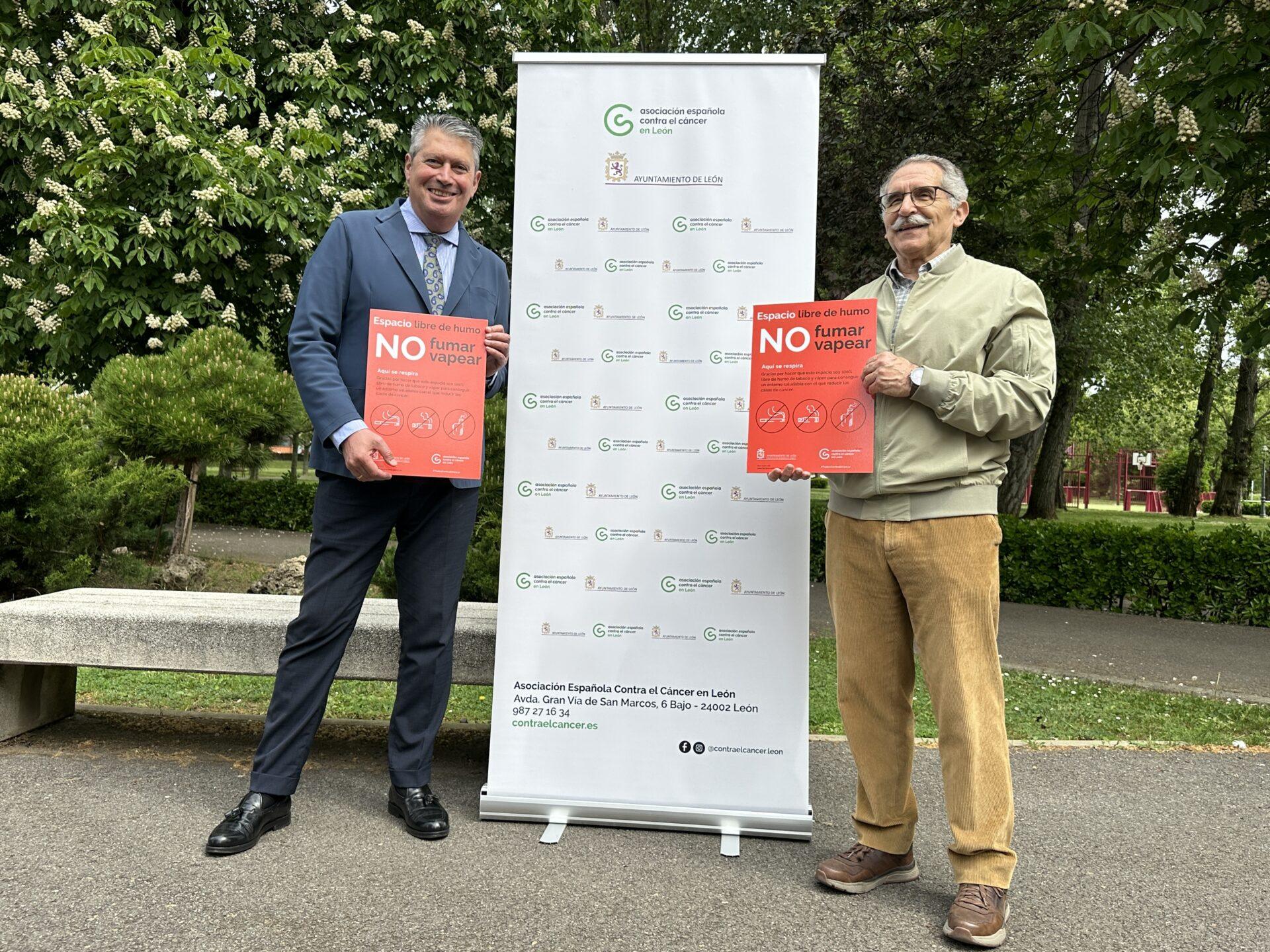 El concejal de Desarrollo Urbano del Ayuntamiento de León, Luis Miguel García Copete, y el presidente de la Asociación Española Contra el Cáncer en León, Estanislao de Luis Calabuig, firmaron este martes un acuerdo de colaboración para convertir en ‘Espacios sin Humo’ los parques de la ciudad, para lo que ambas instituciones se comprometieron a visibilizar y señalizar diversas instalaciones y áreas verdes municipales como lugares libres de tabaco.