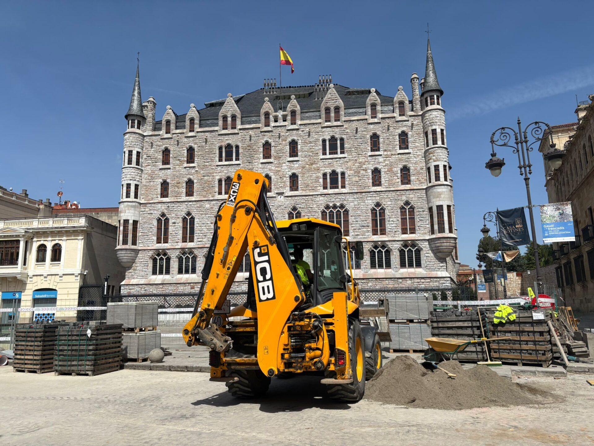 Arranca una nueva semana de obras en el centro de León. La renovación del pavimento de la Calle Ancha alcanza ya el entorno de la plaza de Botines y San Marcelo. Una estampa muy distinta a la elegancia a la que nos tiene acostumbrados la postal del edificio de Gaudí, que ahora aparece con maquinaria pesada frente a su fachada.