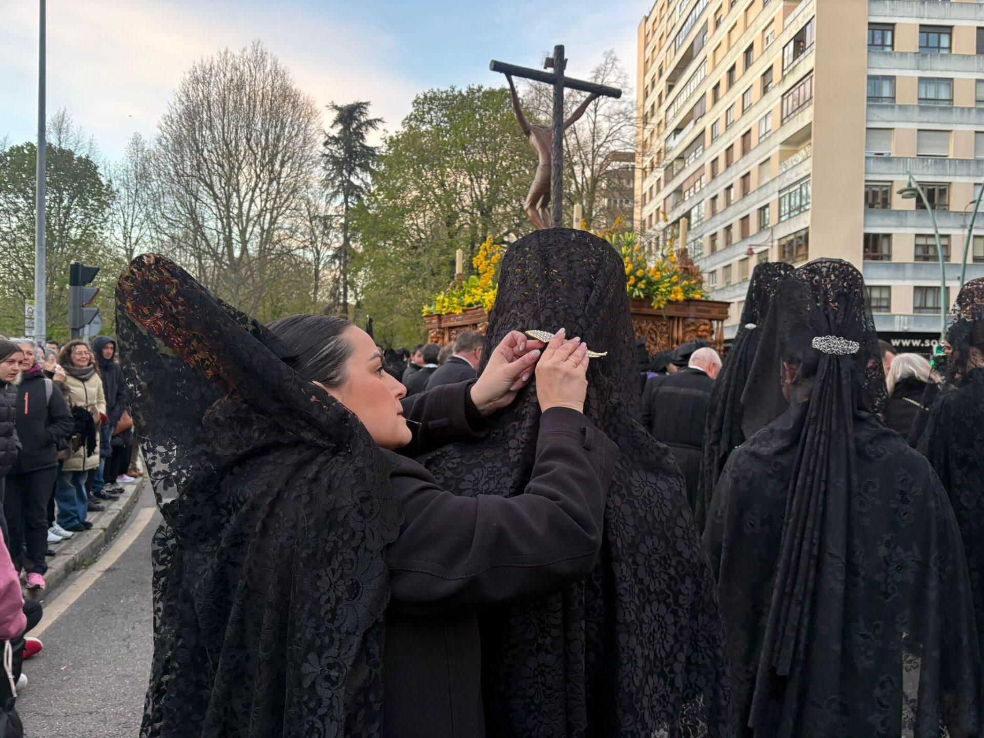 Las Manolas, esas fieles acompañantes de los pasos que lloran la pasión muerte de Jesús son parte importante durante la Semana Santa leonesa. Este Viernes Santo, pasadas las siete de la mañana y antes de comenzar la Procesión de los Pasos se veía a algunas terminando de acomodarse la mantilla sobre la peineta para comenzar un recorrido que duraría diez horas.