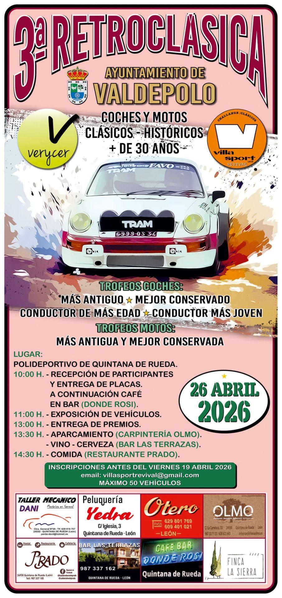El Ayuntamiento de Valdepolo organiza este domingo, 26 de abril, la tercera edición de la Retroclásica, un evento que reunirá en la localidad de Quintana de Rueda a una selección de coches y motos con más de 30 años de antigüedad.