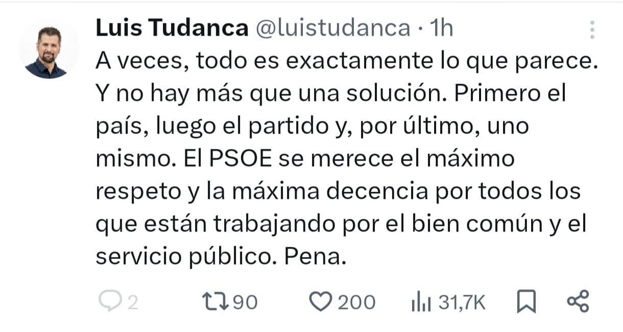 Varios han sido los políticos que se han apresurado a reaccionar en redes sociales, tanto a la dimisión de Santos Cerdán, para la que Luis Tudanca, ex líder del PSOE en Castilla y León, fue uno de los primeros; como para la comparecencia de Sánchez, tras pedir él mismo la dimisión a su número dos, así como que entregara el acta de diputado nacional.