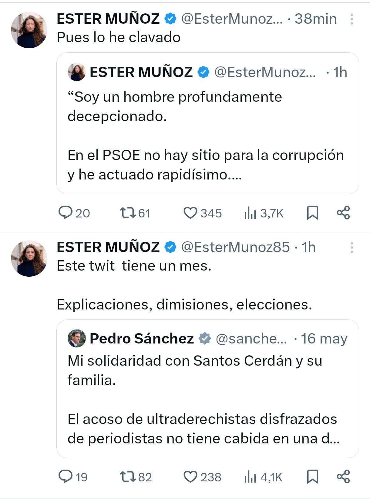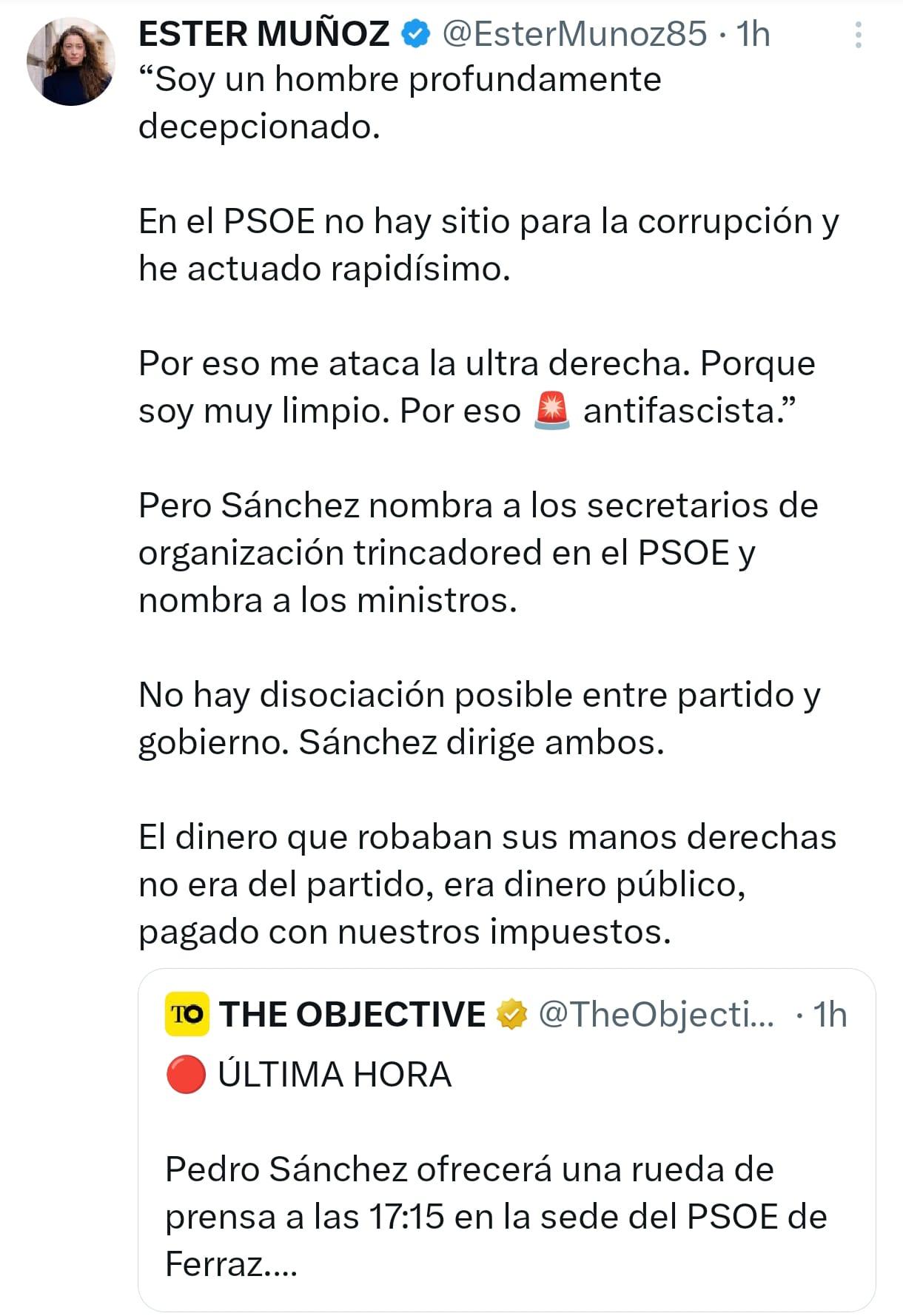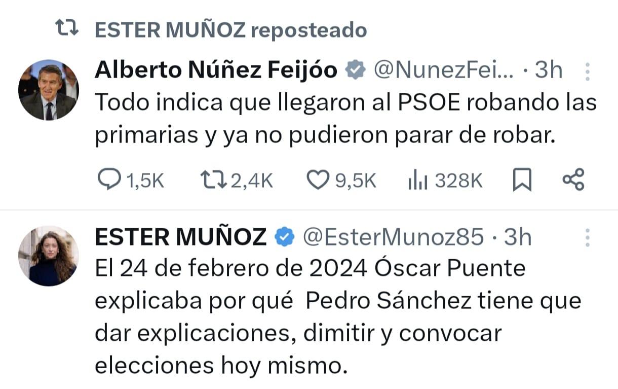 Por su parte, la líder del Partido Popular en León y diputada nacional, Ester Muñoz, pronosticaba las explicaciones que podría dar Sánchez en la comparecencia, apuntando a que se sentiría decepcionado, lamentaría el hecho pero reconocería haber actuado enseguida; para, posteriormente, publicar en redes sociales que había clavado su vaticinio. El número uno de su partido, Núñez Feijóo, hacía alusión a las artimañas por las que el PSOE podría haber llegado al Gobierno y que habrían seguido haciendo, refiriéndose a “robar”.