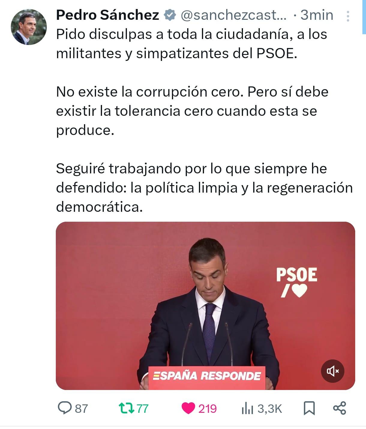 En su comparecencia, Pedro Sánchez ha pedido perdón a la ciudadanía y ha dicho sentirse profundamente decepcionado por una persona en la que confiaba hasta esta mañana. Ha asegurado que fue él quien le pidió a Cerdán que dimitiera y devolviera su acta como diputado nacional, y confía en que dé las explicaciones pertinentes ante la Justicia. Así mismo ha aclarado que no convocará elecciones, pero sí hará una reestructuración de su ejecutiva que se hará pública en julio en el Congreso Federal del PSOE.