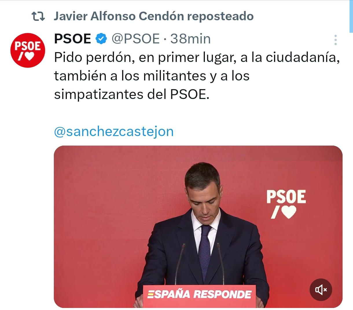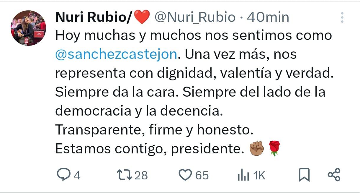 Javier Alfonso Cendón, secretario general del PSOE en León y diputado nacional, ha retuiteado las palabras del presidente del Gobierno y líder de los socialistas en las que reiteraba sus disculpas por esta situación, que como dice, él mismo desconocía hasta leer al completo el informe de la UCO. Nuria Rubio, ex secretaria de Organización del PSOE de León y vicesecretaria del PSOE en Castilla y León, ha escrito unas palabras dirigidas al presidente, apoyando su decisión de dar la cara y uniéndose a la decepción de Sánchez.
