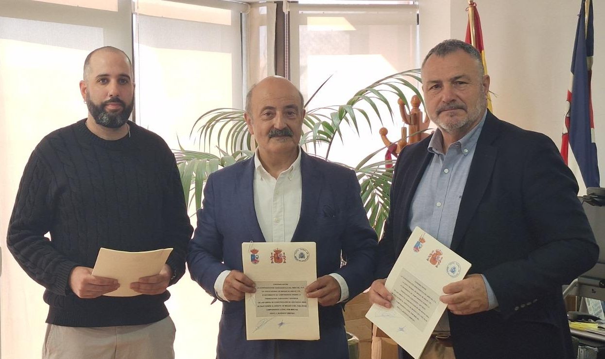El presidente de la CHMS José Antonio Quiroga, junto al alcalde de Camponaraya, Eduardo Morán, y el pedáneo de Magaz de Abajo, Jonathan López, rubricó el convenio para ese nuevo paso que conectará Narayola con Cacabelos.