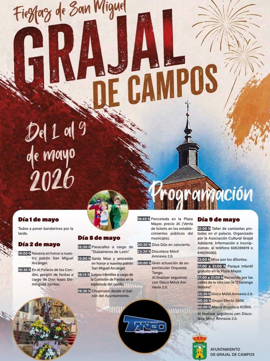 La localidad de Grajal de Campos ya tiene todo listo para celebrar sus tradicionales Fiestas de San Miguel Arcángel, que este año se extenderán del 1 al 9 de mayo. El Ayuntamiento ha presentado un programa variado que combina actos religiosos, música en directo y actividades para todas las edades.