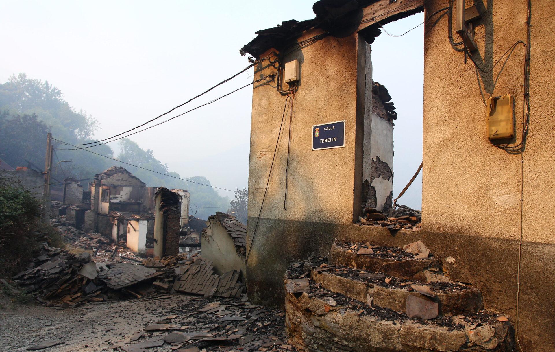 El incendio que comenzó la tarde del domingo en una ladera cercana, empujado por un viento cálido y seco, avanzó sin control hacia el coqueto y minúsculo núcleo urbano. En apenas unas horas, el fuego arrasó con todo. Las casas -algunas centenarias- fueron pasto de las llamas. Casi todas las viviendas se vinieron abajo. Una de las casas que se han salvado albergaba a la Virgen de Santa María, rescatada por una vecina en la ermita de este pequeño pueblo leonés devorado por el fuego, como ha podido comprobar Ical.