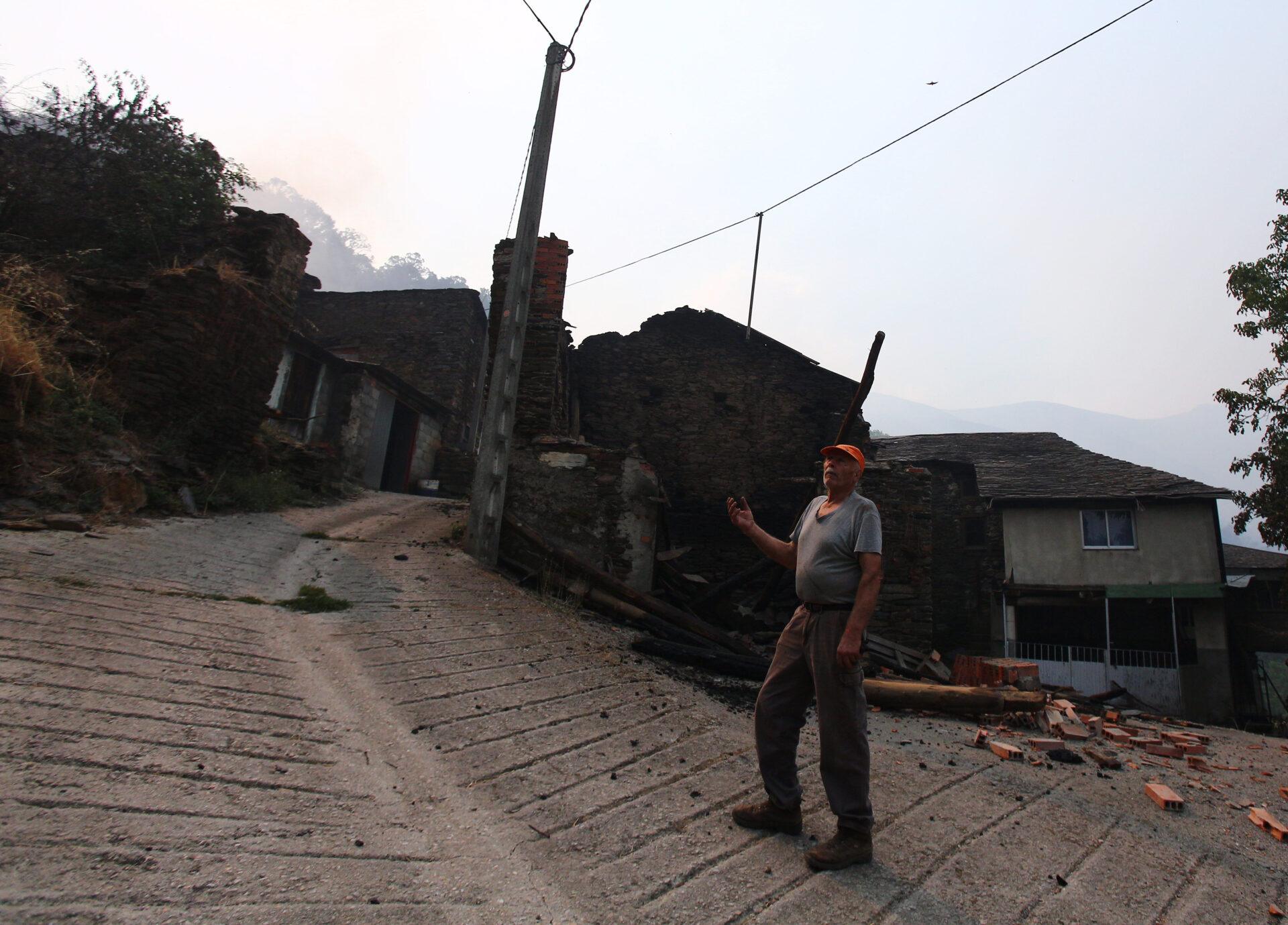 Hoy, el corazón de Lusio está reducido a escombros. Calles cubiertas de ceniza, muros derruidos, tejados colapsados y árboles carbonizados forman un escenario que recuerda más a una zona de guerra que a un pueblo rural. En medio de esa desolación, una figura solitaria se mueve entre los restos calcinados: un hombre de avanzada edad recoge algunas pertenencias que han quedado en lo que fue su hogar.