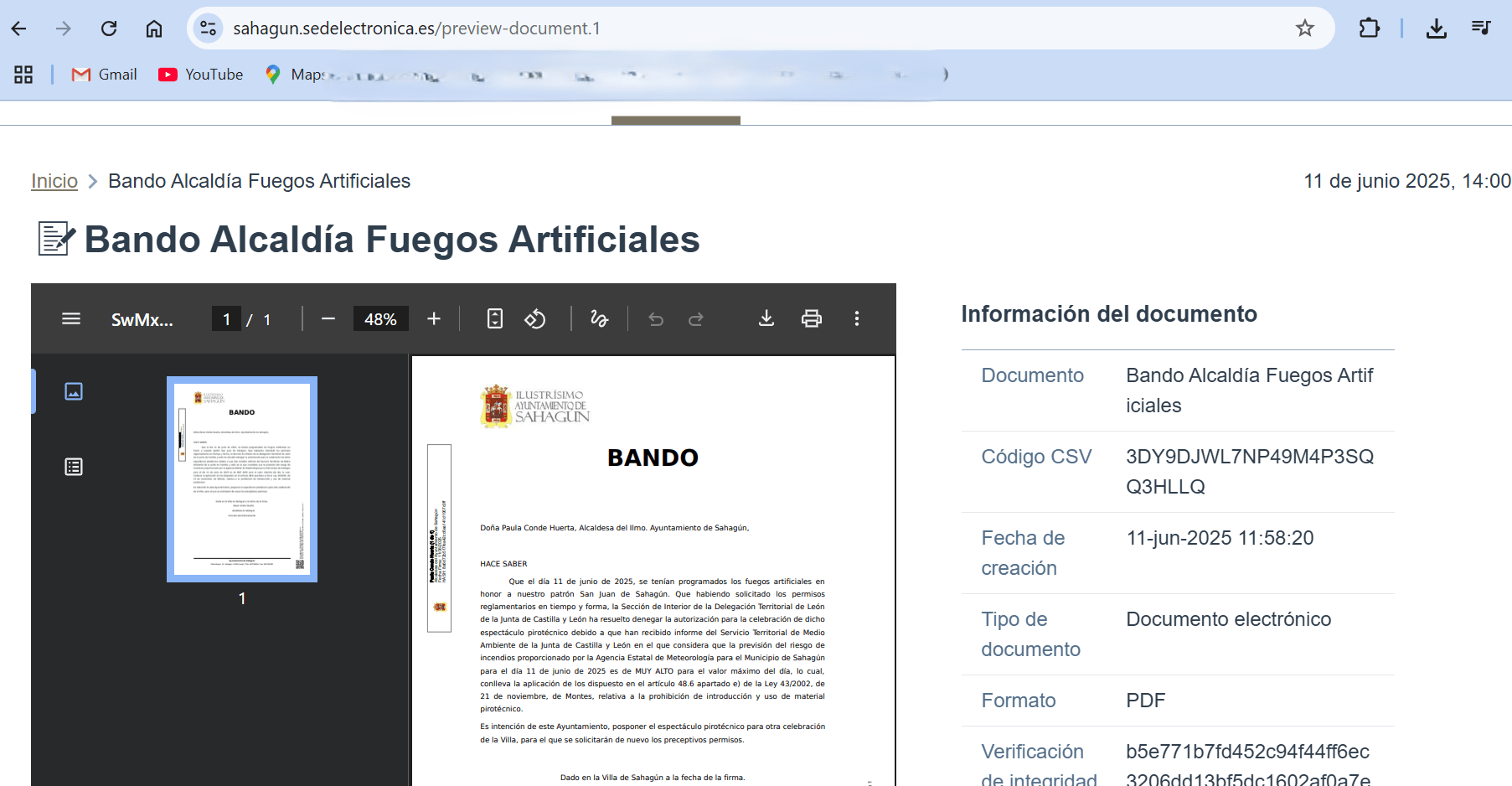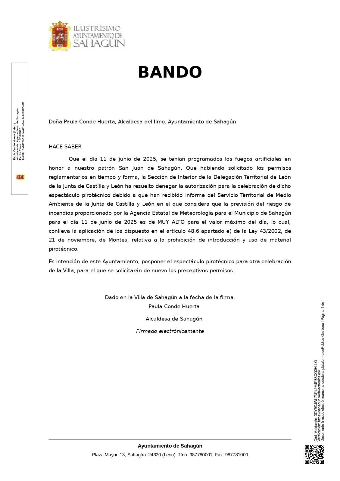 La celebración de los tradicionales fuegos artificiales en honor a San Juan, previstos para el 11 de junio de 2025 en Sahagún, ha sido pospuesta por decisión del Ayuntamiento. La alcaldesa, Paula Conde Huerta, ha emitido un bando oficial comunicando la resolución, que obedece a un informe desfavorable del Servicio Territorial de Medio Ambiente de la Junta de Castilla y León.