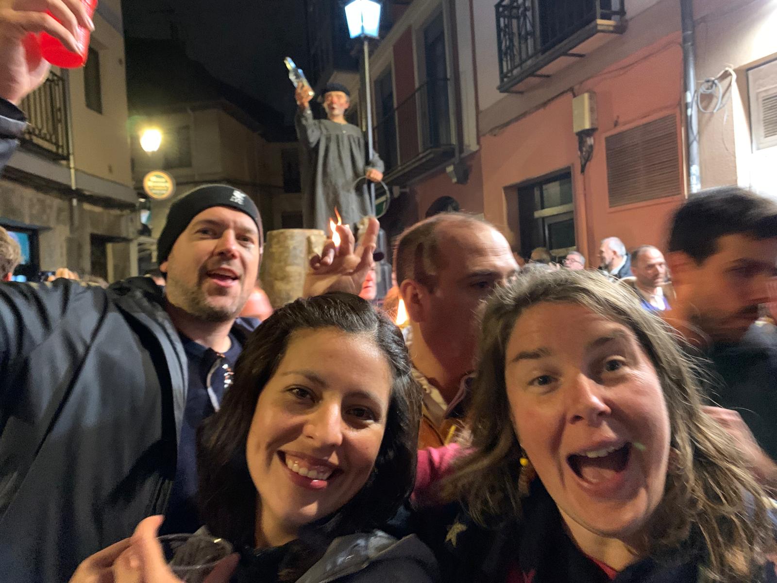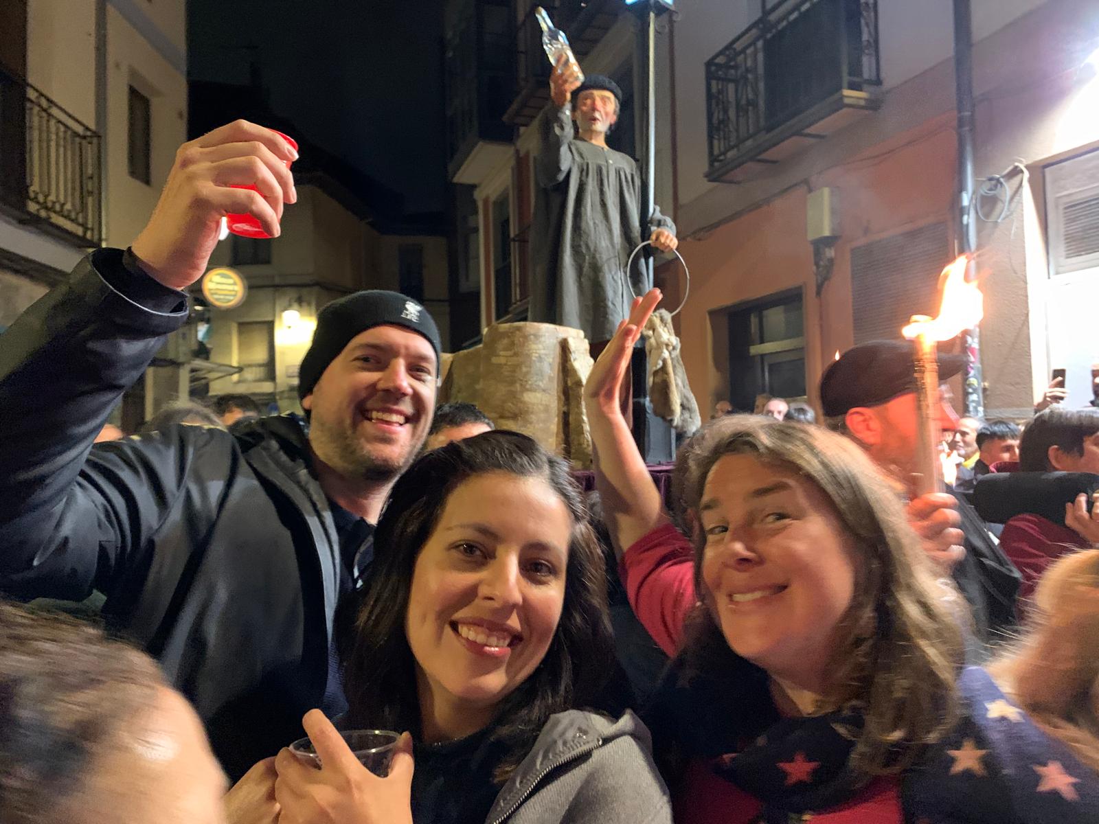 “Espero una noche divertida, hablar con gente, estar con amigos, ir al Húmedo y seguir la procesión”, barrunta la inglesa. “Haremos lo que hacen los demás: de bar en bar, de vino en vino, de copa en copa, matando judíos”, añade el de Liubliana. “Tomar, beber, besar, abrazar… y lo que surja”, bromea Vicky.