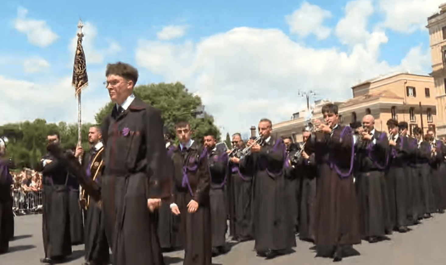 El emblemático Nazareno de la Cofradía del Dulce Nombre de Jesús Nazareno de León ya se encuentra en las calles de Roma, formando parte de la gran procesión del Jubileo de las Cofradías que se celebra hoy en la capital italiana. Bajo un sol radiante y una temperatura de 23 grados, la comitiva inició su recorrido a las 14:00 horas desde la Piazza Celimontana, congregando a un público internacional entre el que destaca un millar de peregrinos procedentes de León.