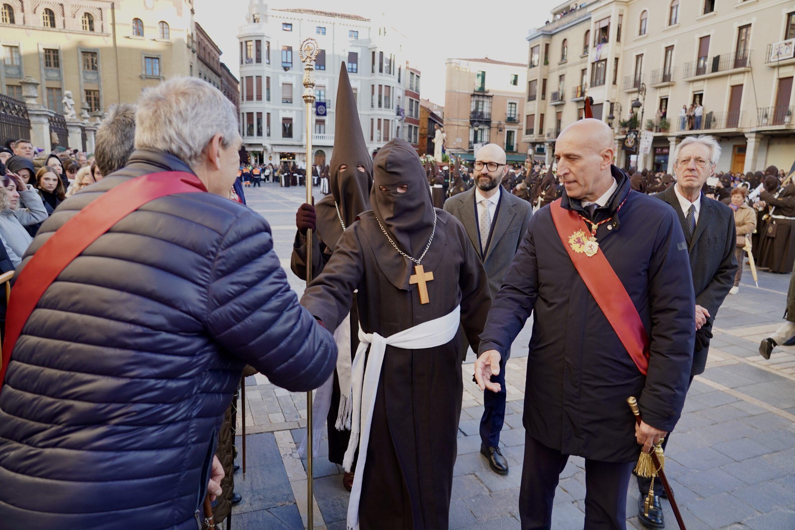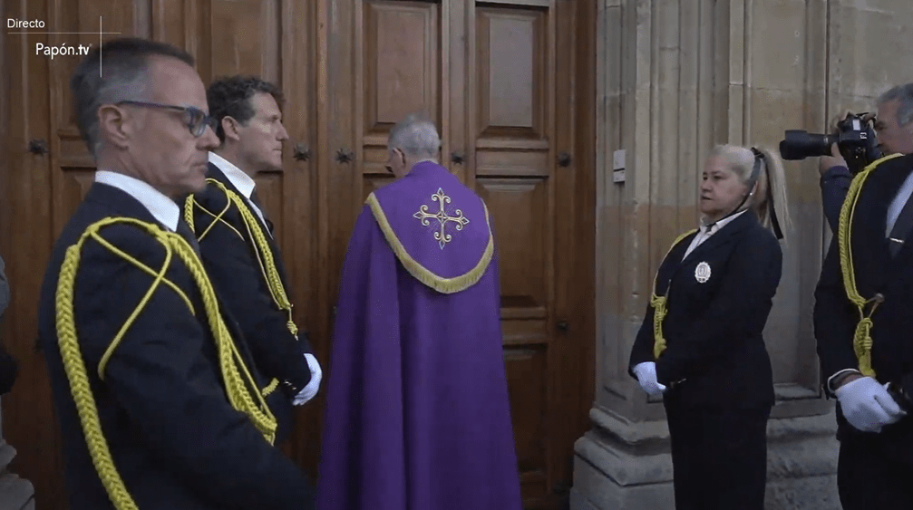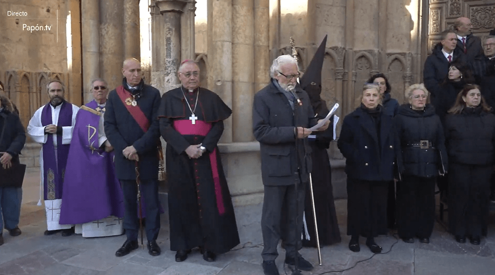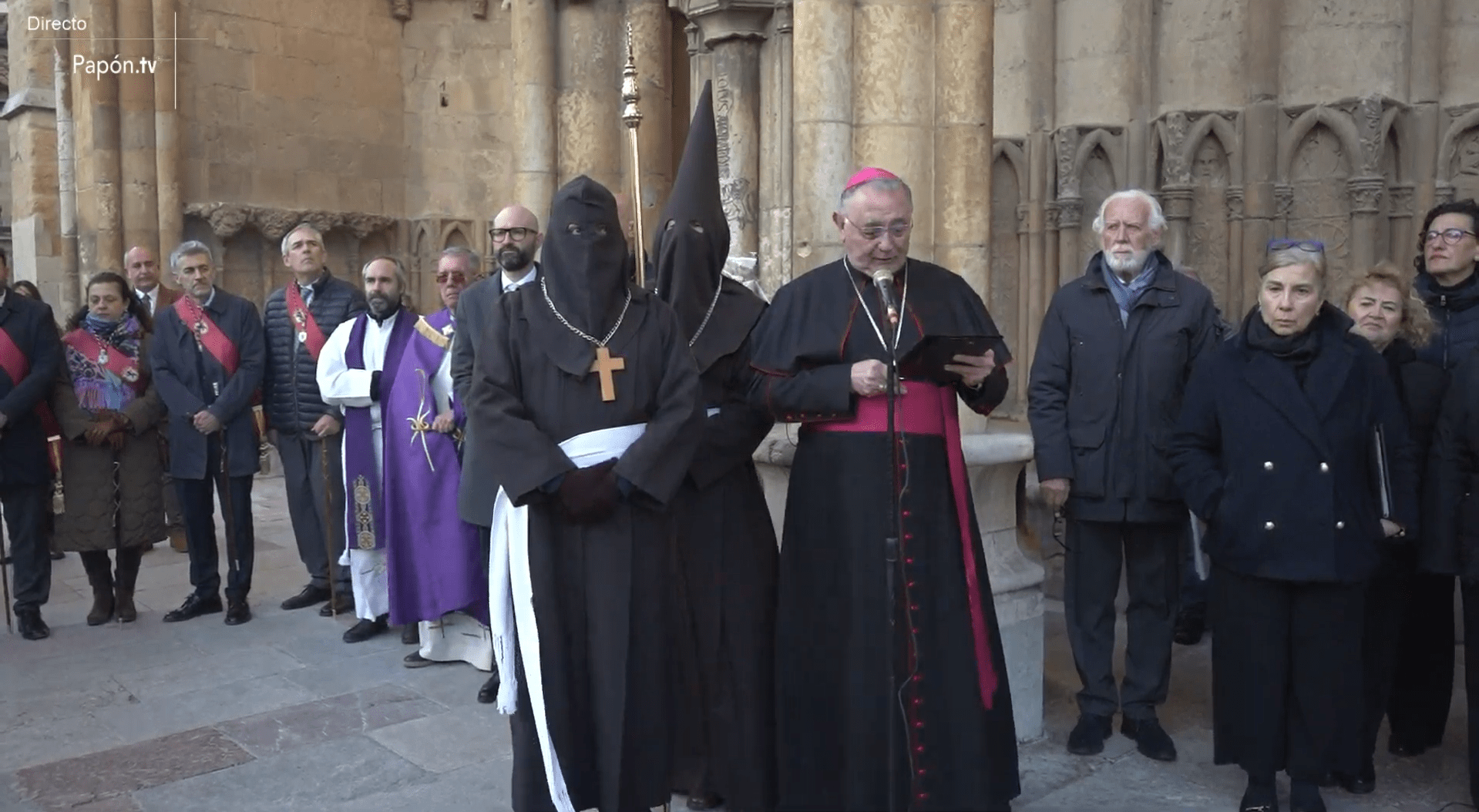 El obispo Luis Ángel de las Heras expresó la alegría por la tregua que dio la lluvia esta tarde. Asimismo dio su enhorabuena al preso al que se le concedió la libertad condicional, E.G., en “un extraordinario signo de esperanza”. “Nos congratulamos con la Cofradía del Santo Cristo del Perdón por su atención a los internos en la procesión del perdón”, añadió antes de desear “que sea enhorabuena”.