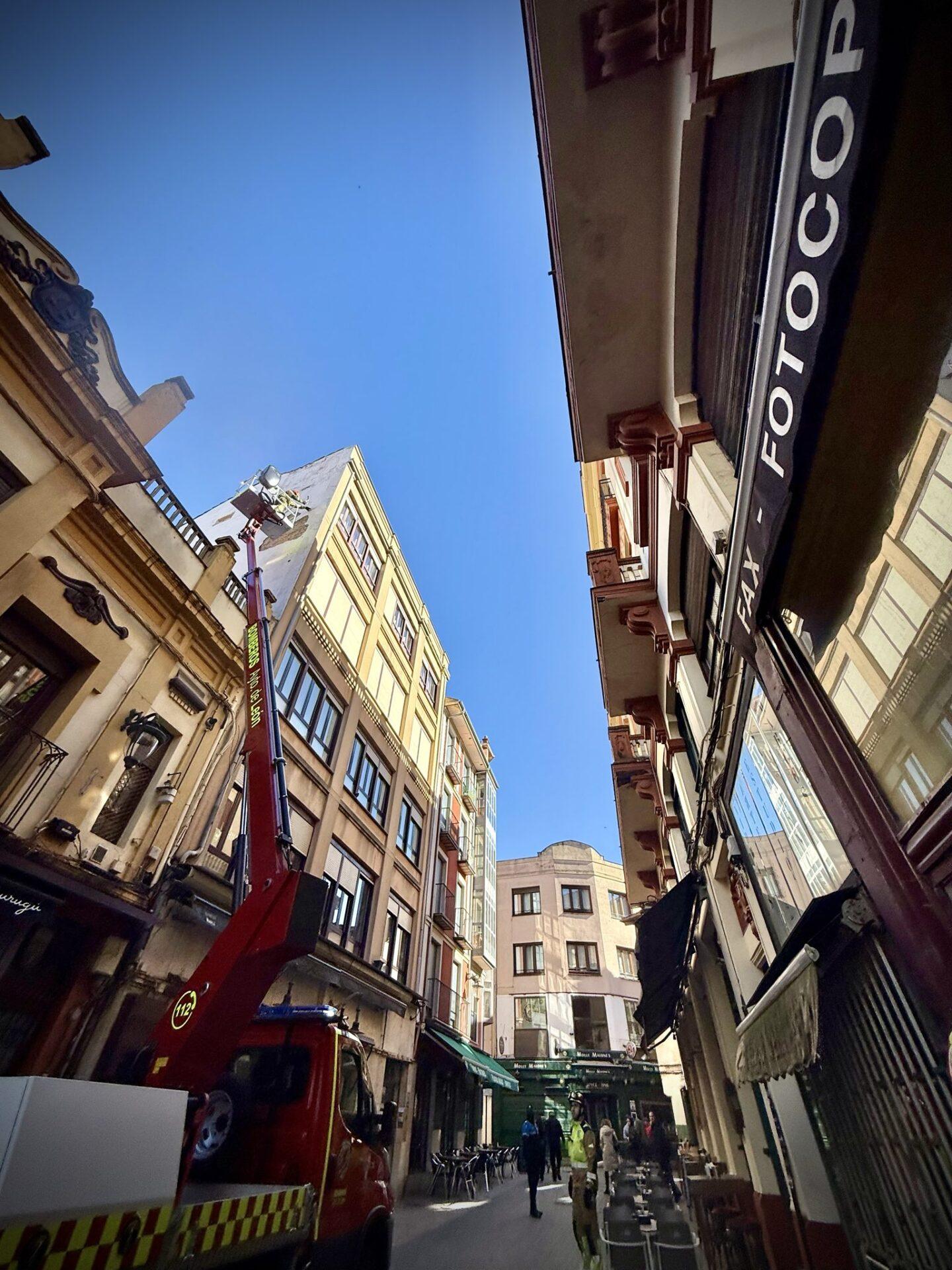 La cara menos visible del temporal no siempre está en los charcos. A veces está en lo alto: cornisas, aleros, remates y piezas que el viento y la lluvia aflojan bruscamente y sin avisar. Ese fue, precisamente, el principal foco de trabajo de Bomberos de León en la jornada de ayer, 14 de febrero, en la que el cuerpo realizó más de una veintena de intervenciones, la mayoría relacionadas con revisiones de fachadas por desprendimientos provocados por el episodio de mal tiempo del pasado temporal.