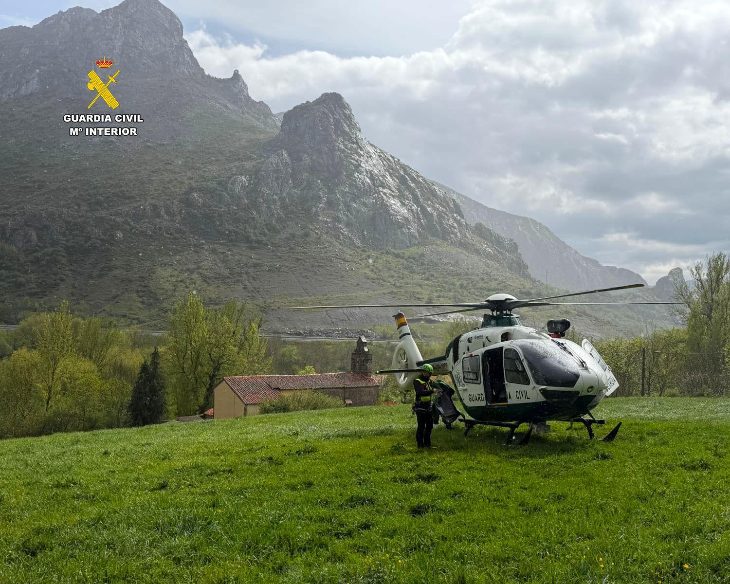 El helicóptero del Servicio Aéreo de la Guardia Civil, con base en León, recogió a dos especialistas del GREIM de Sabero y se dirigió a la zona. A las 10:50 horas se localizó a la víctima y a su acompañante, que se encontraban separados unos 20 metros.