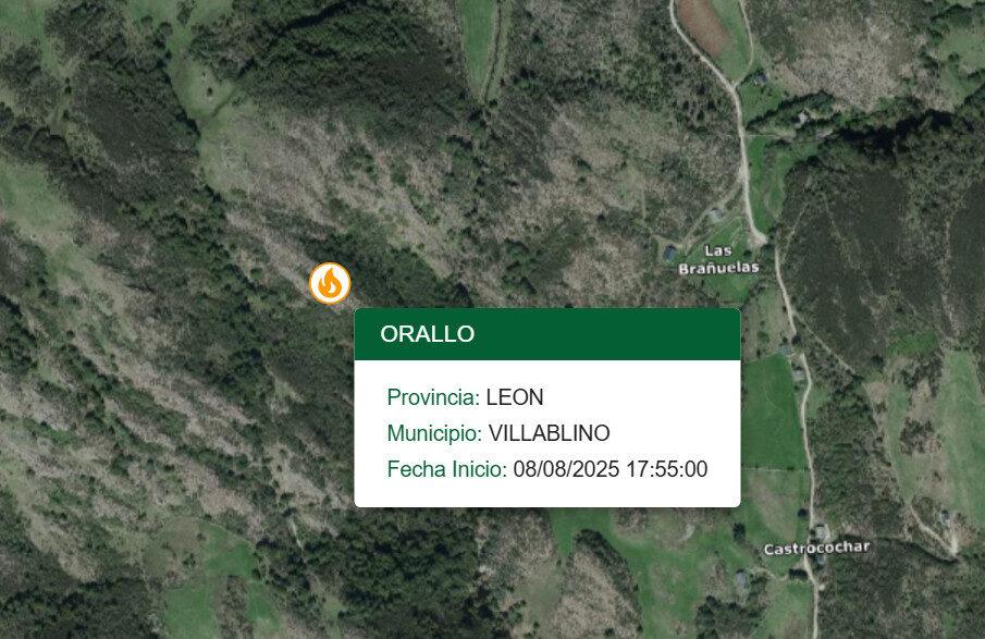 Un nuevo incendio forestal ha sido registrado en la provincia de León, esta vez en la localidad de Orallo, en el municipio de Villablino. El fuego, que se inició a las 17:55 horas de hoy, se atribuye a un probable impacto de rayo.